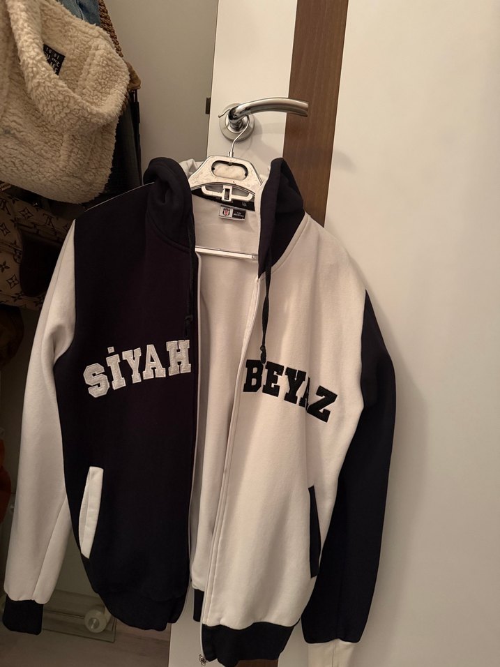 Fermuarlı, kapüşonlu ve uzun kollu erkek sweatshirtü. Siyah-beyaz baskılı ve sokak stili görünüme sahip. Yumuşak ve sıcak kumaştan, cepli. Sadece sırt baskısında hafif yıpranma var onun dışında hiç bir sorunu yoktur
