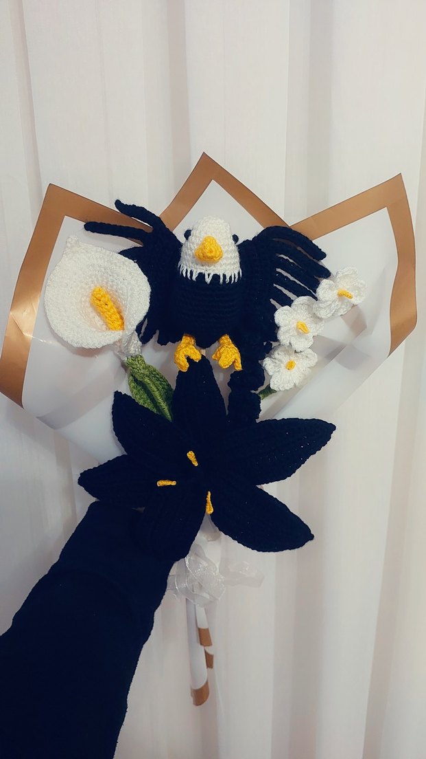 El örgüsü taraftar , siyah ve beyaz iplikten kartal ve çiçeklerin bulunduğu buket, sevdiceginize alabiliceginiz guzel bir hediye secenegiKara kartal aşktir