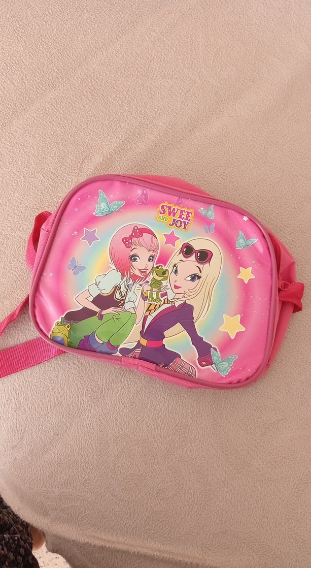 Pastel pembe çocuk okul çantası, kelebek ve yıldız desenleriyle süslenmiş renkli karikatür baskısına sahiptir. Ayarlanabilir askısı vardır.