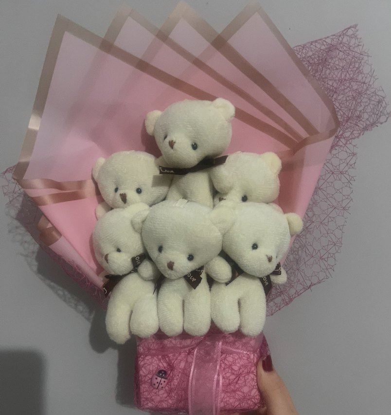 Beş yumuşak beyaz peluş ayıcığın pastel pembe ambalajla düzenlendiği şirin bir buket.