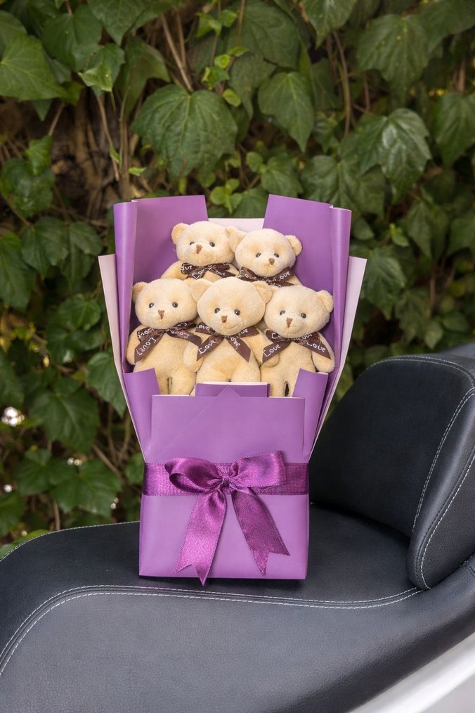 Beş küçük ayıcığın canlı mor kağıda sarıldığı ve uyumlu kurdeleyle bağlandığı renkli bir hediye buketi .