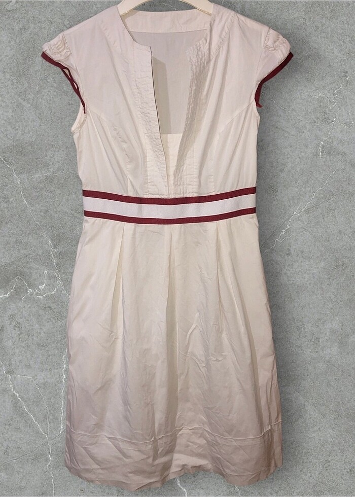 İki kol arası 37 cm, boy 90 cm. Elbisenin kırmızı çizgi altında hafif sarılık vardır. Kollarındaki şeritlerde hafif açılma vardır. Fotolar detaylı çekilmiştir. Ceplidir. İçi astarlıdır. Yüzde 75 pamuk, yüzde 21 naylon, yüzde 4 elastan. S-m uyumludur