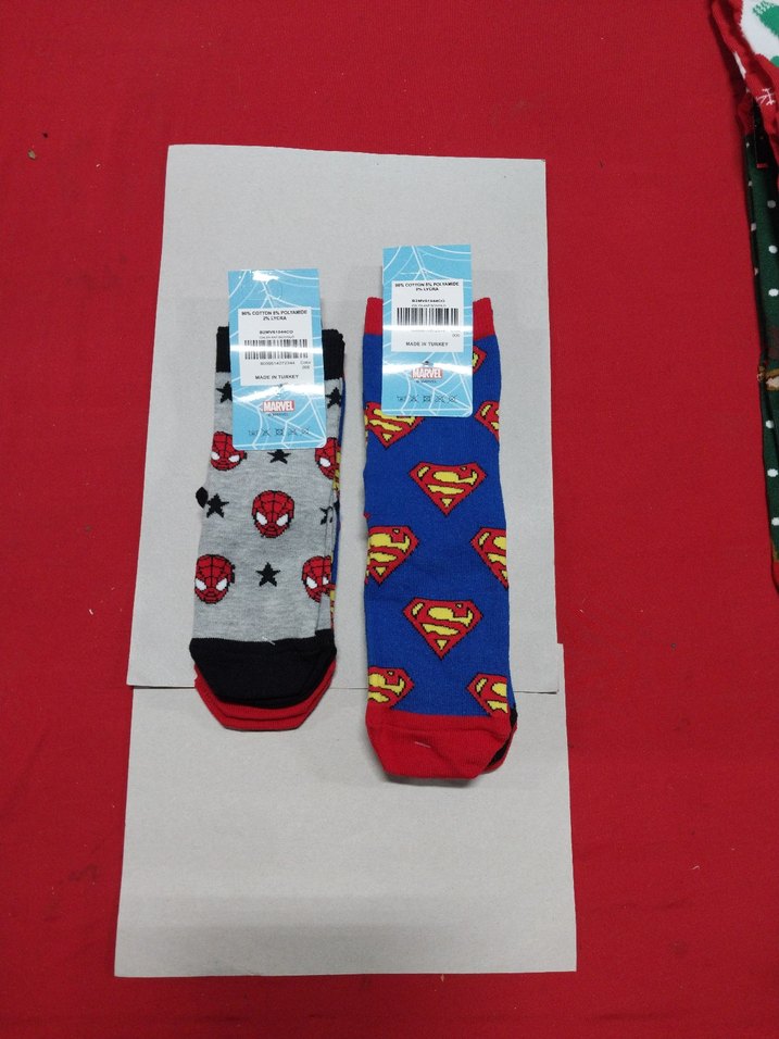 Renkli erkek çocuk çorapları, bir çift gri üzerinde Örümcek Adam, diğer çift mavi üzerinde Superman baskılıdır. çocuk corap yaşlar 5 7 9 11 yas Ürün ler pamuklu dur 10 cift