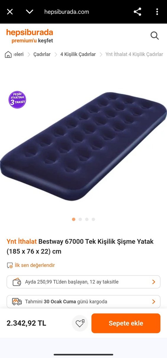 Lacivert renkli Bestway tek kişilik şişme yatak, 185x76x22 cm ölçülerindedir. Çocuklar için rahat uyku sağlar, 12 ay taksit imkanıyla satın alınabilir. ️