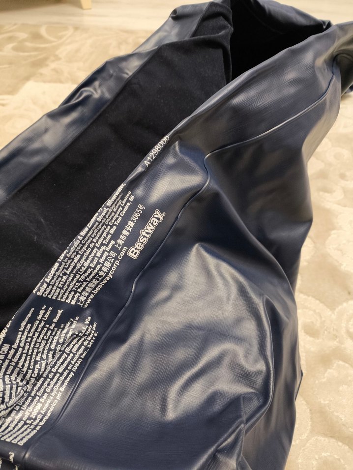Sentetik kumaştan yapılmış, fermuarlı, baskılı desenli, straplez yakalı ve uzun kollu, fitted kesim erkek lacivert uzun yağmurluk.
