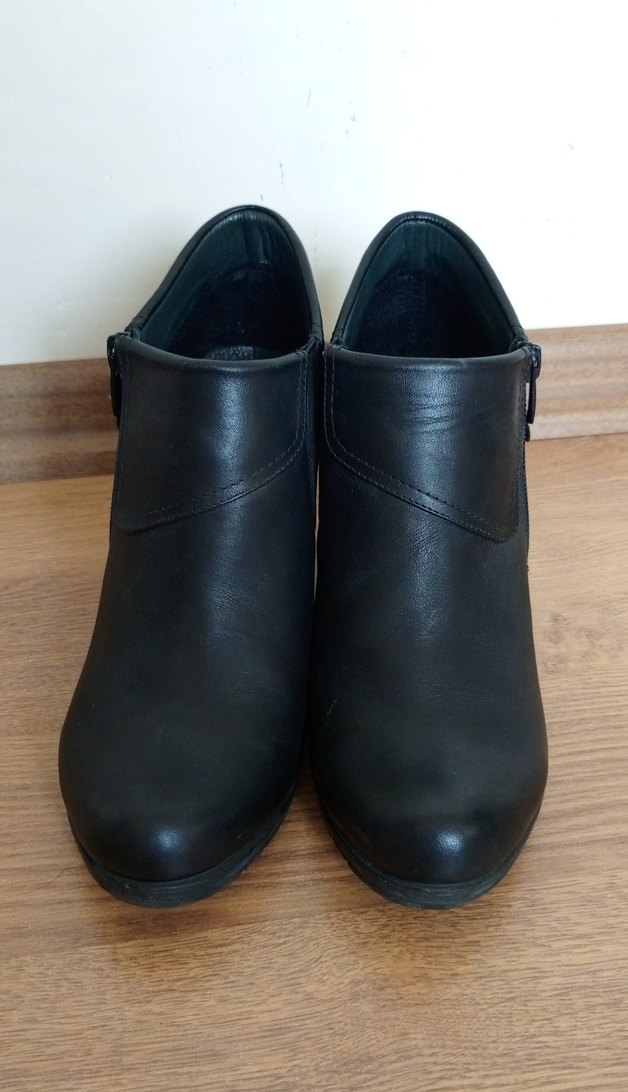 Kadınlar için siyah deri dolgu topuklu bot. Minimalist goth tarzında, ofis kullanımı için uygun.