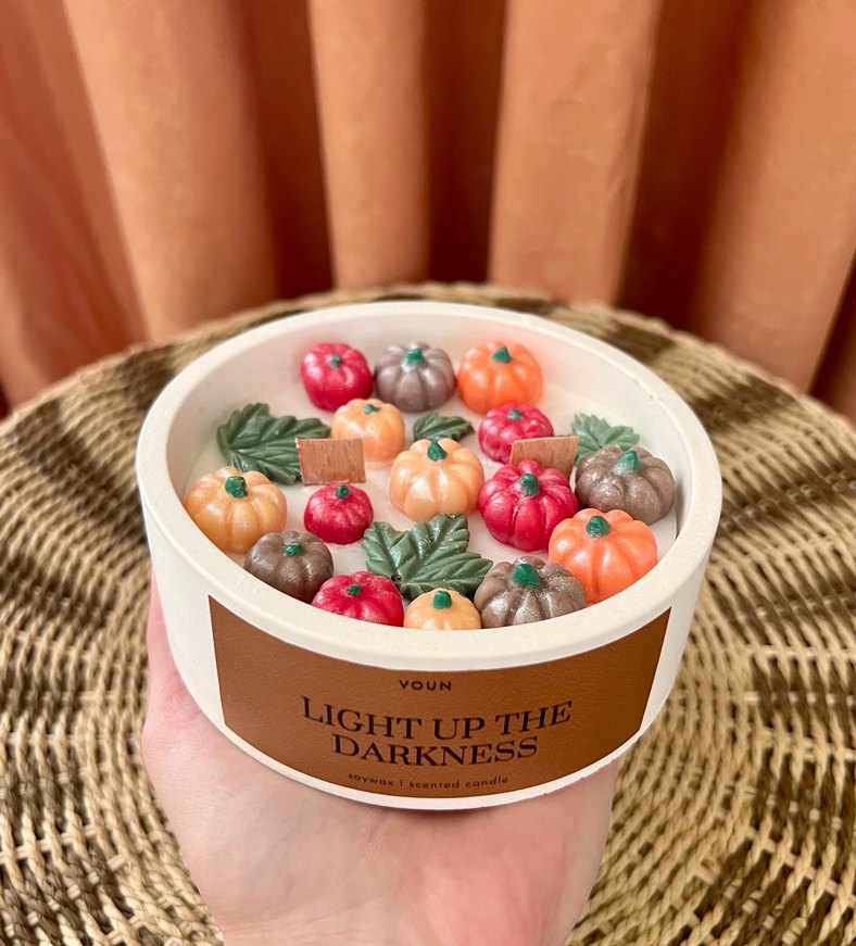 Çeşitli açık kahverengi ve turuncu tonlarda küçük balkabağı şeklinde süslemeler ve yeşil yapraklar içeren, yuvarlak beyaz kapta kokulu mum.