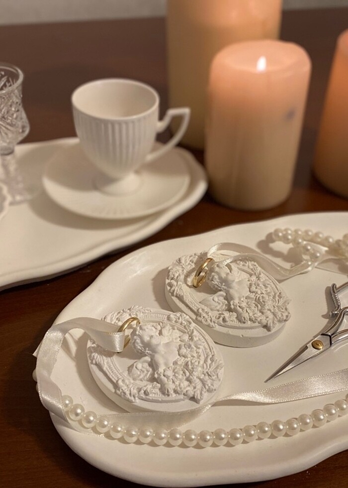 2 adet oval tepsi Fincan ve su bardağı, lokumluk 2 adet Melek figürlğ yüzük tutucu Makas İnci Kurdale