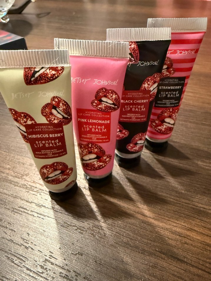 Betsey Johnson'ın nemlendirici dudak balsamı, pembe tonlarda ve meyveli kokularda. Yumuşak ve nemlendirici formül.