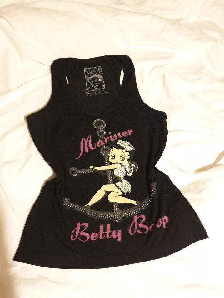 lisansli 1 adet var siyah pamuklu, fitted kesim, Betty Boop denizci baskılı ve parlak detaylı, tokalı kadın atlet. Kolsuz, yuvarlak yaka, rock punk ve grunge tarzlarına uygun.