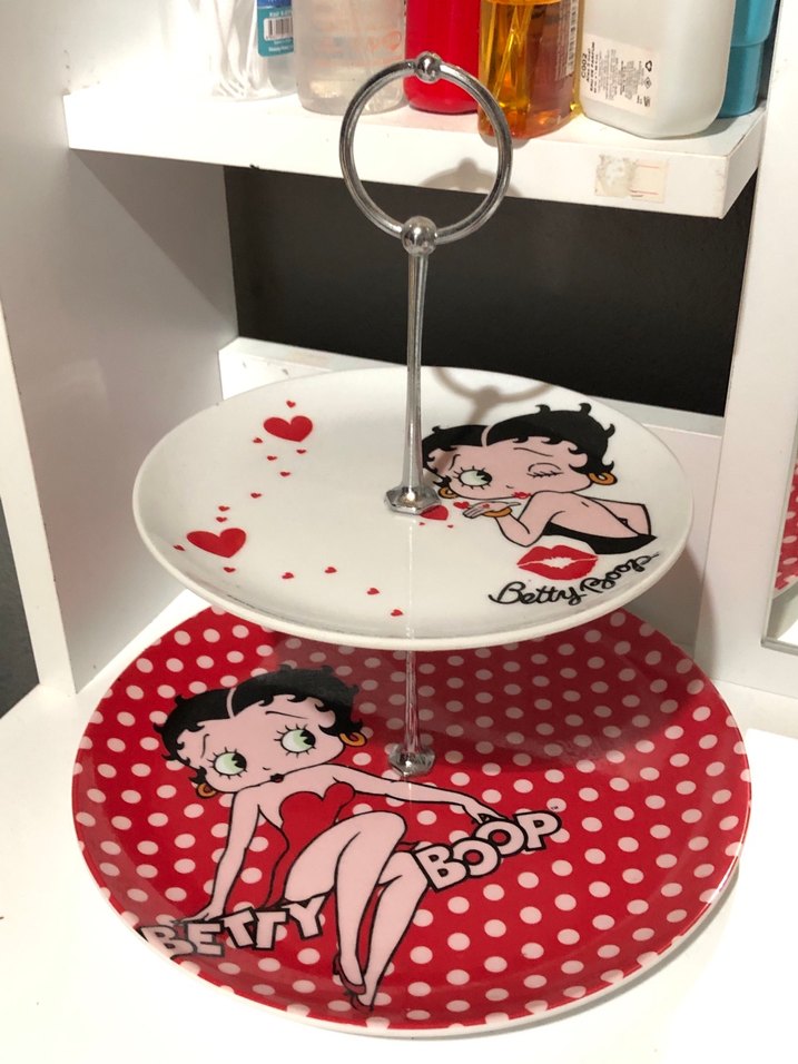Betty Boop figürlü, parlak kırmızı renkli 2 katlı servis tabağı. Metal sapıyla kolay taşınabilir, atıştırmalık ve tatlılar için uygundur. Kullanmadım hic sorunu yok