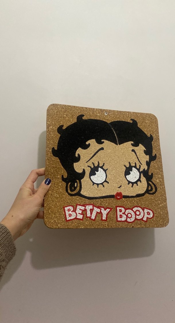 Bu parlak kahverengi mouse pad mantar dokusuna sahip olup büyük Betty Boop yüzü ve "BETTY BOOP" yazısı içerir. OCR metni "BET/YBOOP" bulunur. ️