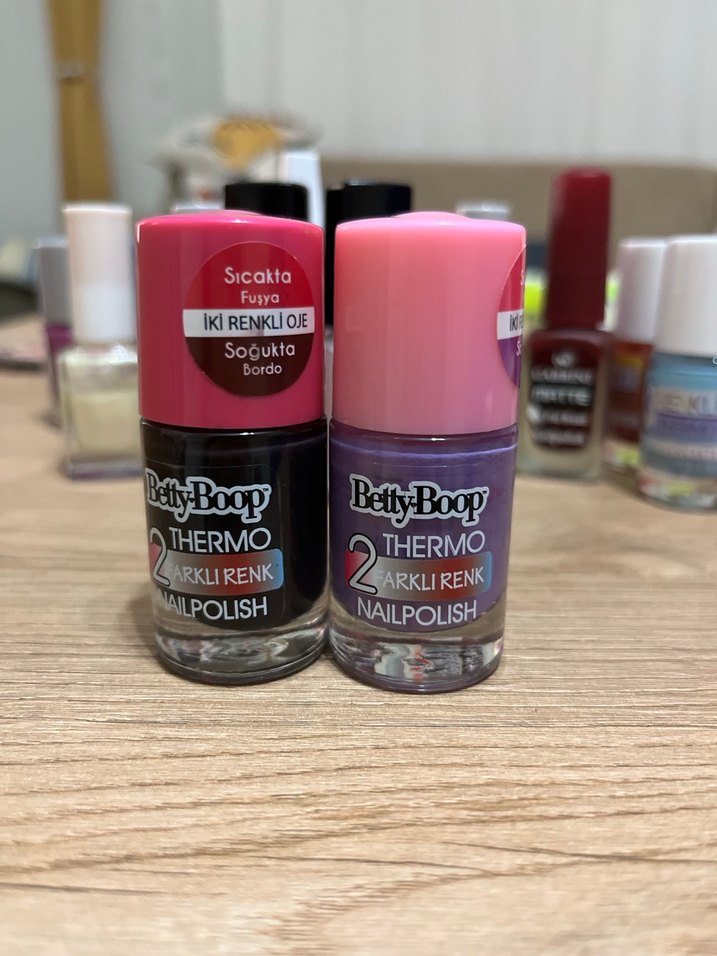 Betty Boop termo ojede sıcaklıkla fuşya, soğukta bordo renk değişimi sağlar. İki renkli özel tırnak ojesi. Bir iki kere kullandım ikisini de çoğunluğu doludur. Tek kat sürmeyle bile etkili renk değiştiriyor sıcağa soğuğa göre.