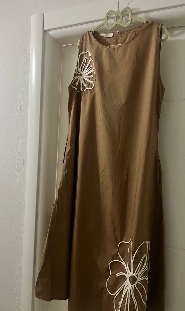 İtalya yapımı, %100 pamuk kumaştan,kolsuz, şık ve rahat elbisedir. Kumaşı paraşüt kumaşa benzer hafiflikte ancak keten hissiyatı olduğu için doğal kırışıklık yapısı vardır. Bu da elbiseye salaş ve modern bir duruş kazandırır. Kahverengi tonu ve beyaz çiçek detaylarıyla oldukça zarif bir tasarıma sahiptir. Şık ve rahattır. Oversize kesimlidir, tek bedendir. Sadece bir defa giyilmiştir.Hiçbir deformesi yoktur.