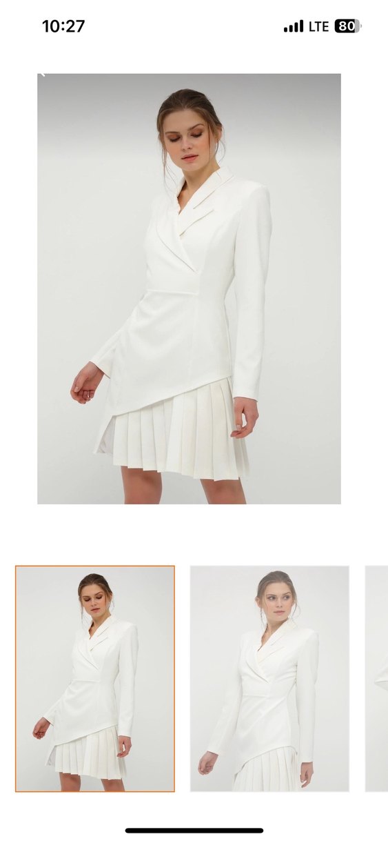 Beyaz, mini uzunlukta, pilili etekli, uzun kollu ve kesimli yakalı elbise. Nişanım için 3 elbise sipariş vermiştim uzun giymeyi tercih ettiğim için aldığımdan beri kutusunda etiketiyle duruyor.