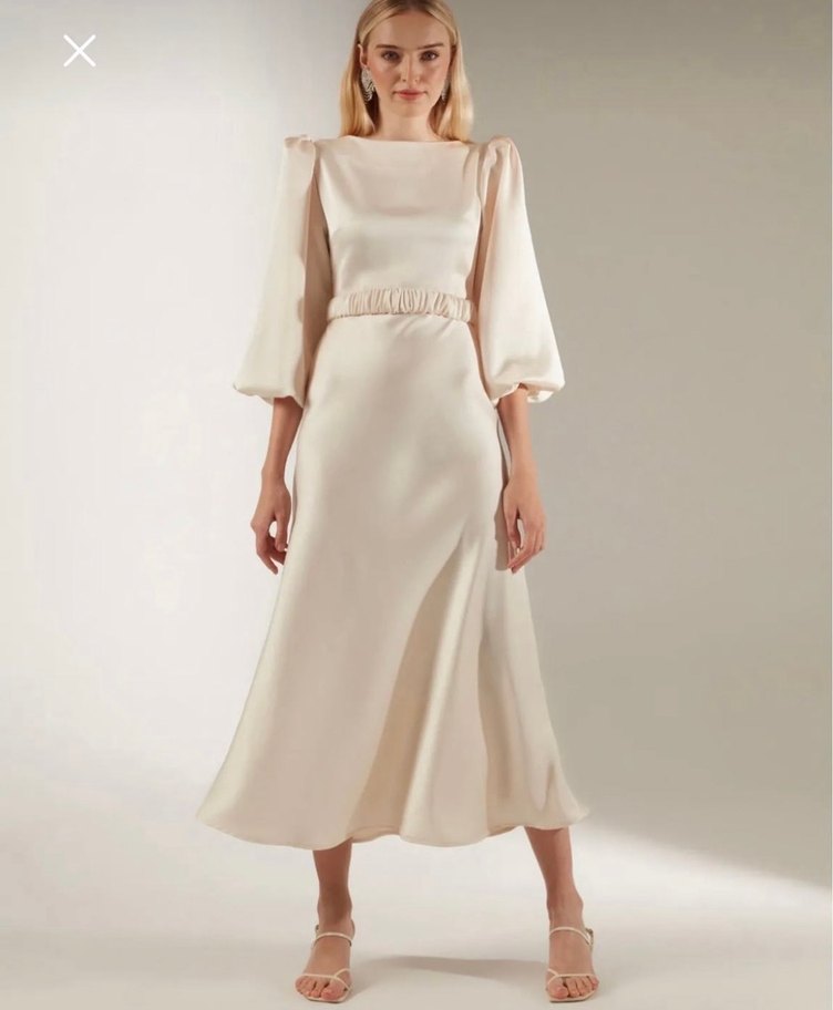 Uzun beyaz elbise, saten kumaş, tekne yakalı ve uzun kollu. 1 kez nikahta giyildi, nişan için de uygun. Hiç bir defosu yok, alındığı gibi. Ben 169 boy, 56 kg ile giydim