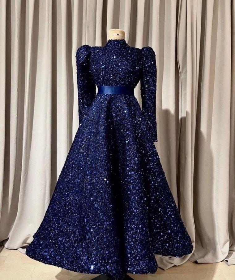 Lacivert renkli, yüksek yakalı ve uzun kollu abiye elbise. Parlak simlerle süslenmiş, düzenli kesimli ve çağdaş tarzda, düğünler için uygun. ✨