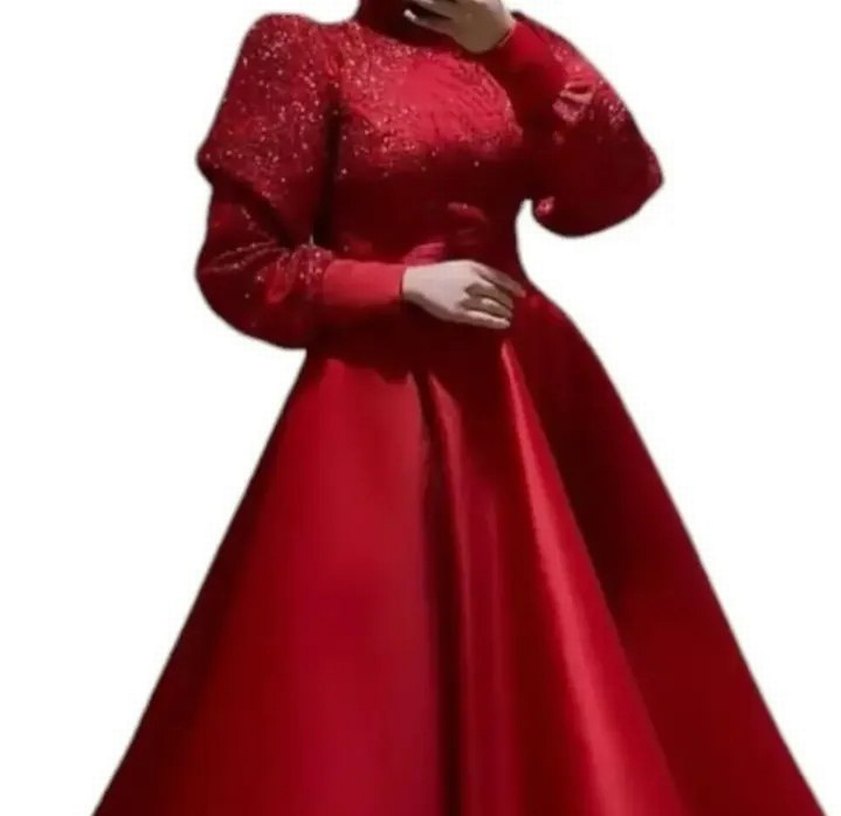 Bu kırmızı abiye, yüksek yakalı ve uzun kollu, parlak desenli kumaş ve drapeli detaylara sahip, düğünler için uygun.