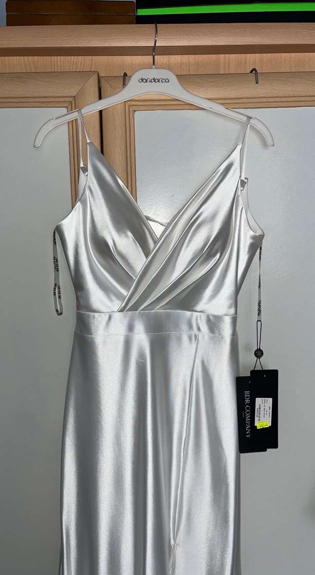 V yakalı, yırtmaçlı ve askılı uzun, beyaz saten renkli, klasik kesim abiye elbise. Göğüs kapları mevcuttur. Düğün için uygun şık tasarım. Hiç giyilmedi etiketi üzerinde