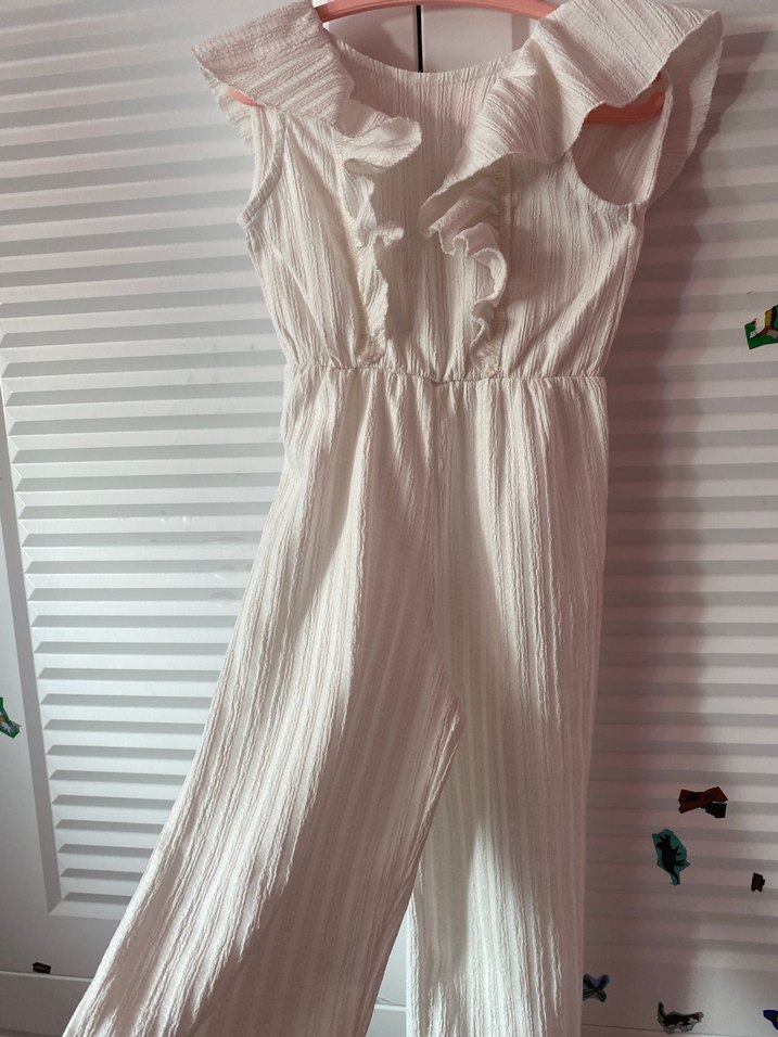 Beyaz keten kumaştan, pilili ve fırfırlı askılı kollara sahip, V yakalı bol kesim bohem tulum.