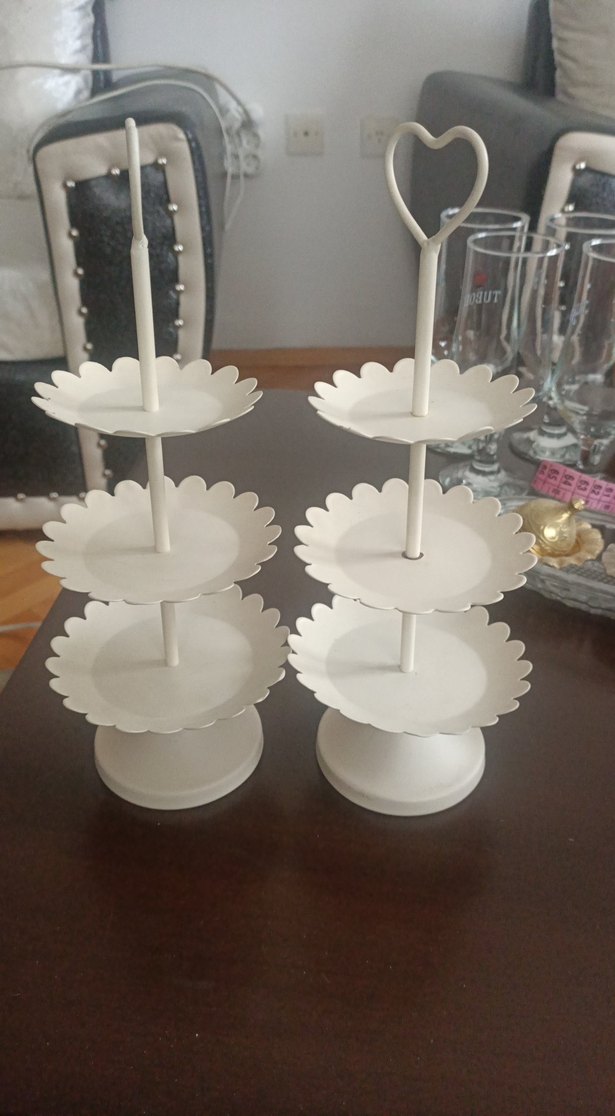 Beyaz, üç katlı metal tatlı standları, dalgalı kenarlarıyla kek veya hamur işi servisine uygun. Biri kalp şeklinde kulplu.