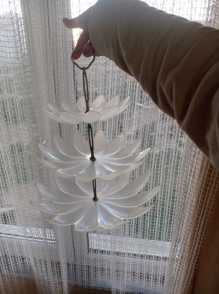 Beyaz, çok katlı cam askıda üç adet çiçek şeklinde tepsi bulunur, mutfak eşyalarını düzenlemek için uygundur. ️toplam 50 cm civarı uzunluğu. sedefli güneşte çok güzel parliyor