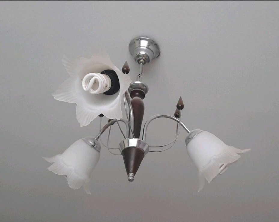 Beyaz, çiçek şeklinde cam başlıkları ve metal gövdesi olan 3 kollu tavan lambası. Ürün temiz ve hasarsızdır. ( İç ampulleri ürüne dahil değildir )