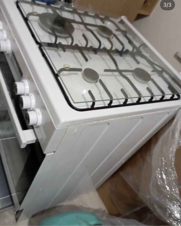 Beyaz renkte, dört gözlü gazlı ocak. Yanında kontrol düğmeleri ve üstünde cam kapak bulunur. Mutfak için uygundur.