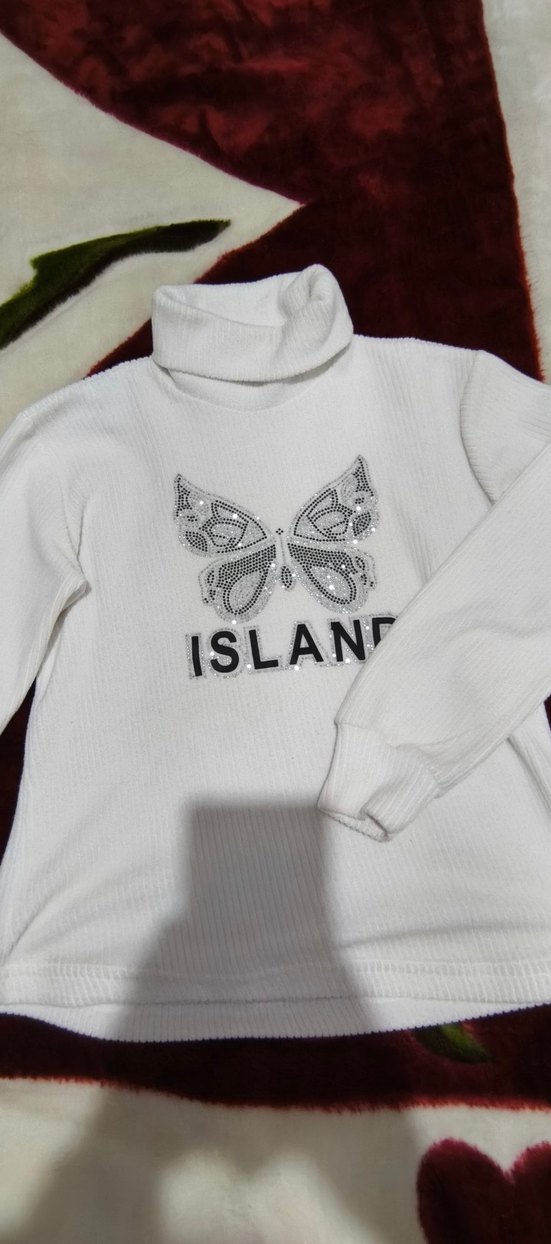 Beyaz boğazlı ve uzun kollu, örme kumaştan yapılmış bol kesim bir kadın kazağıdır. Önünde kelebek deseni ve "ISLANE" yazısı bulunur.