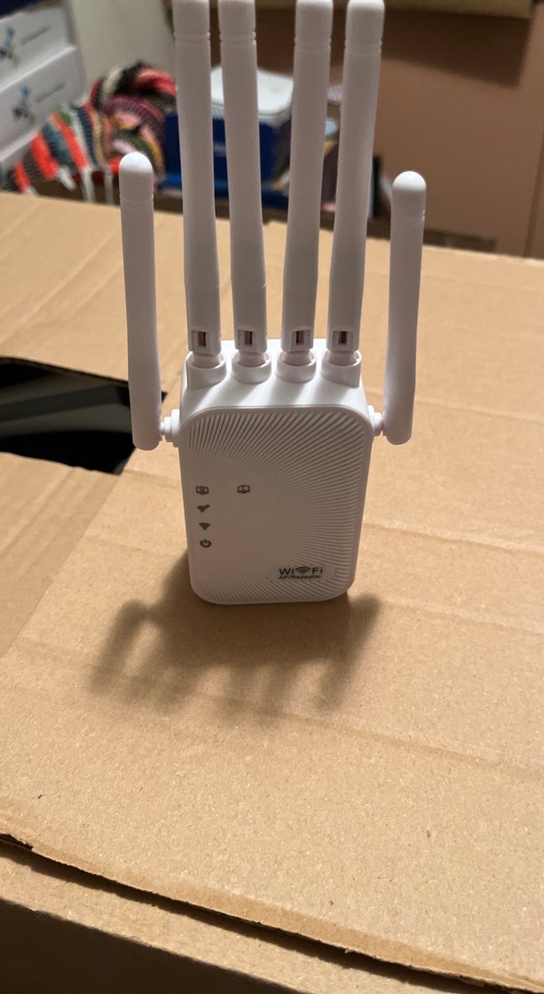 Beyaz renkte, beş antenli WiFi sinyal güçlendirici. Kablosuz bağlantıyı genişletir ve sinyal gücünü artırır. Kompakt tasarım.