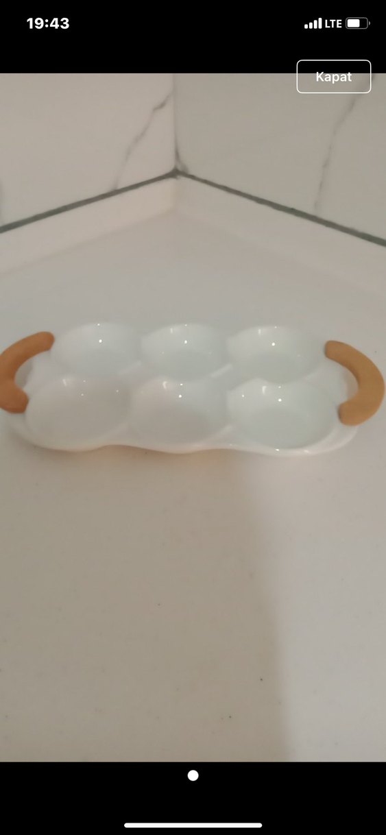 Ahşap saplı, beyaz porselenden yapılmış 6 gözlü kahvaltılıkve servis için uygundur.