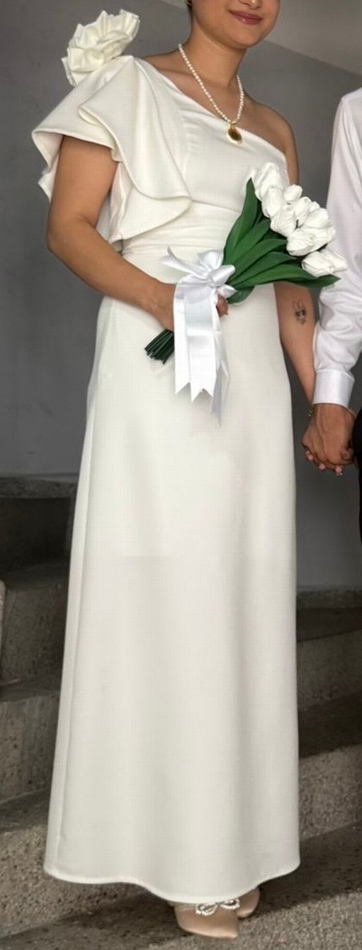 Beyaz renkte, askılı kolsuz ve A kesim uzun gelinlik. Modern klasik tarzda, sade ve şık bir görünüm sunar. Nikahımda giyindim sadece çok hoş çiçek detayı var zarif gösteriyor.
