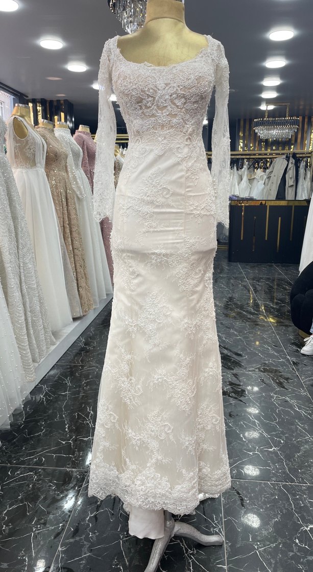 Beyaz renkte, tekne yaka ve askılı kollara sahip A kesim uzun gelinlik. Düzenli kesim ve zarif dantel detaylarıyla göz alıcıdır.