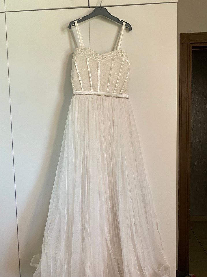 Beyaz, yaka ve ince askılı, uzun etekli, vintage ve modern klasik tarzda, vücuda oturan A kesim gelinlik.