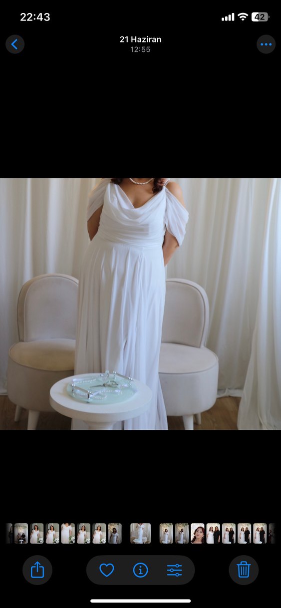 Beyaz A kesim uzun gelinlik, straplez yakalı ve bol kesimdir. Modern klasik tarzda, kolsuz ve minimal bir görünüme sahiptir.