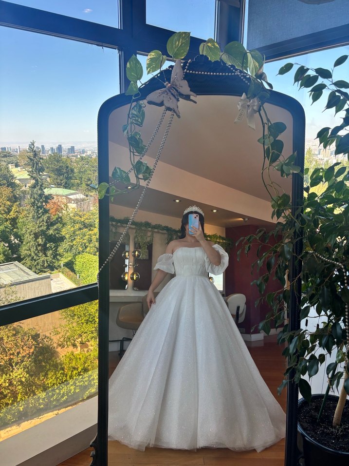Bu beyaz, A-line gelinlik, straplez yakası ve ince askılarıyla modern klasik ve Paris tarzını yansıtıyor. Fitted kesimiyle zarif bir duruş sunar. 36 38 bedenlere uyumludur.Arkası ip bağlamalı ayarlanabilir.Straplez Balon kol.2 adet duvak,taç, ve tarlatanı ile gönderim sağlanacaktır.Yeni sadece 1 kez kullanıldı.