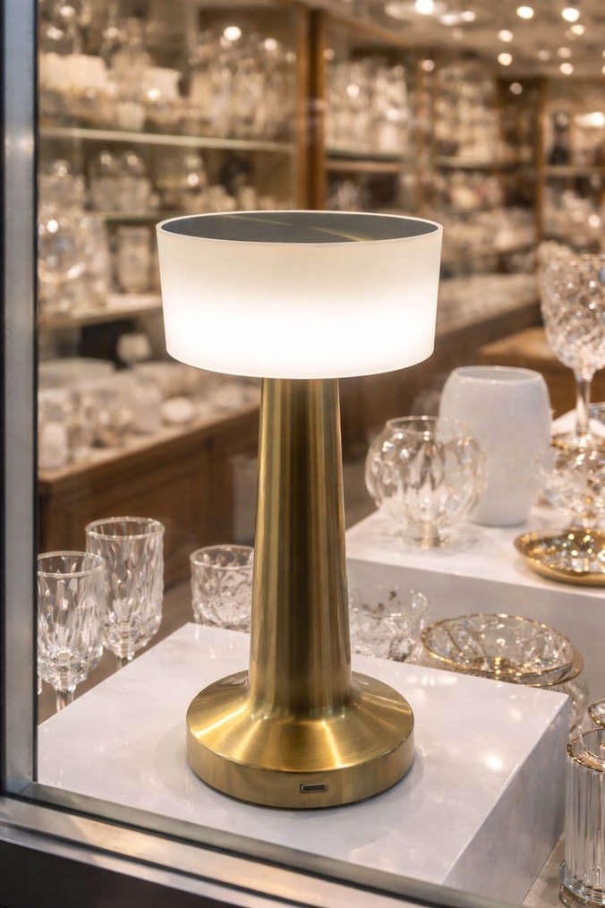 Beyaz abajurlu ve altın metal ayaklı masa lambası, yumuşak ortam ışığı sağlar. Modern tasarımıyla farklı mekanlara uyumlu. Üç farklı renk ışık veriyor
