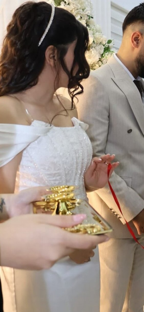 Uzun, vücuda oturan gelinlik tarzı, işlemeli çiçek desenli gövde ve düz saten etekle modern klasik ve vintage şıklığını birleştiriyor. sadece nişanında giyindim 12 bine aldim 2-3 saat giyinildi