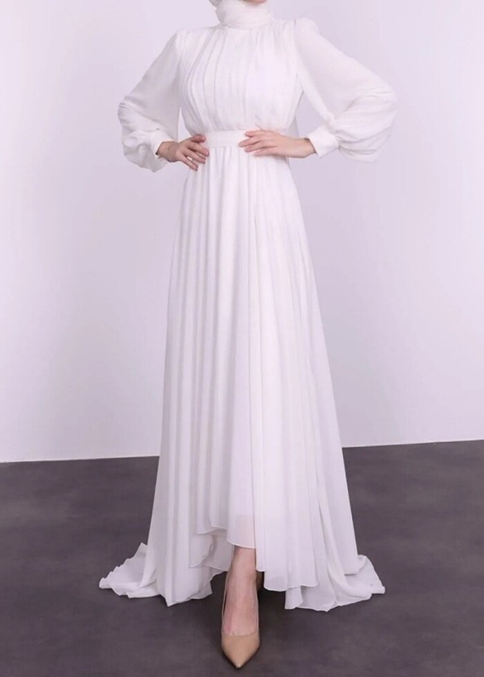 sadece birkere nikahimda kullandm balon kol sırtından fermuarlı düz beyaz kuşaklı tül elbise tiril tirildir iç astarı pamuklu ve çok rahat bir kullanımı vardır. kuyruklu ve şık zarif bir görünüme sahip. ben topuklu giymediğim için kuyruk detayı resimde belli olmuyor