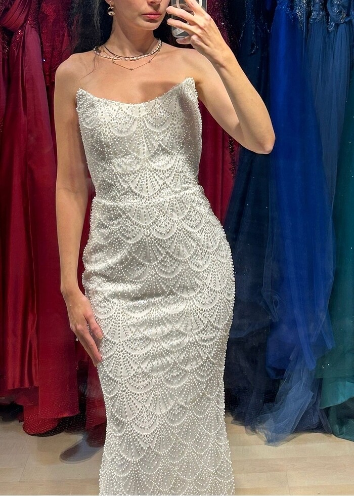 Ürün sadece üç saat giyildi, nişan için :) Arkası hem fermuarlı hem ipli kendinize göre ayarlayabilirsiniz. Hafif balık model, üstü boncuk ve inci işlemeli. İki astarlıdır. Özel tasarım bir daha giyemeyeceğim için satıyorum maalesef