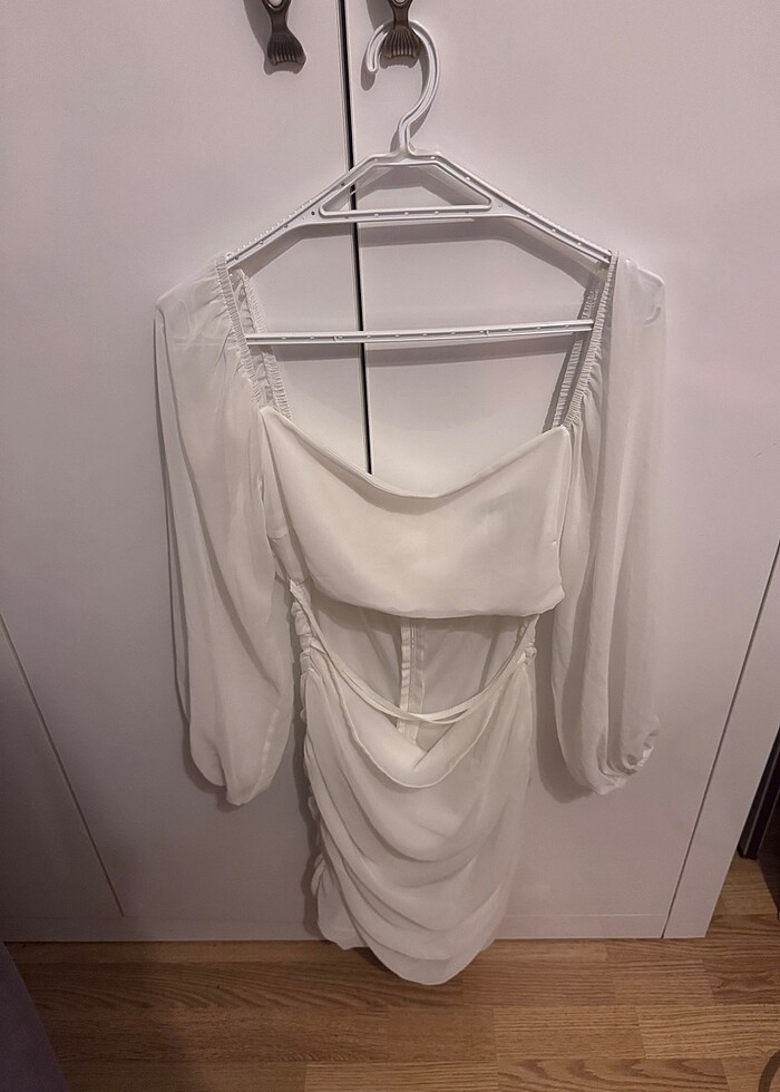 Hiç kullanılmamış etiketi üstünde beyaz tül davet elbisesi