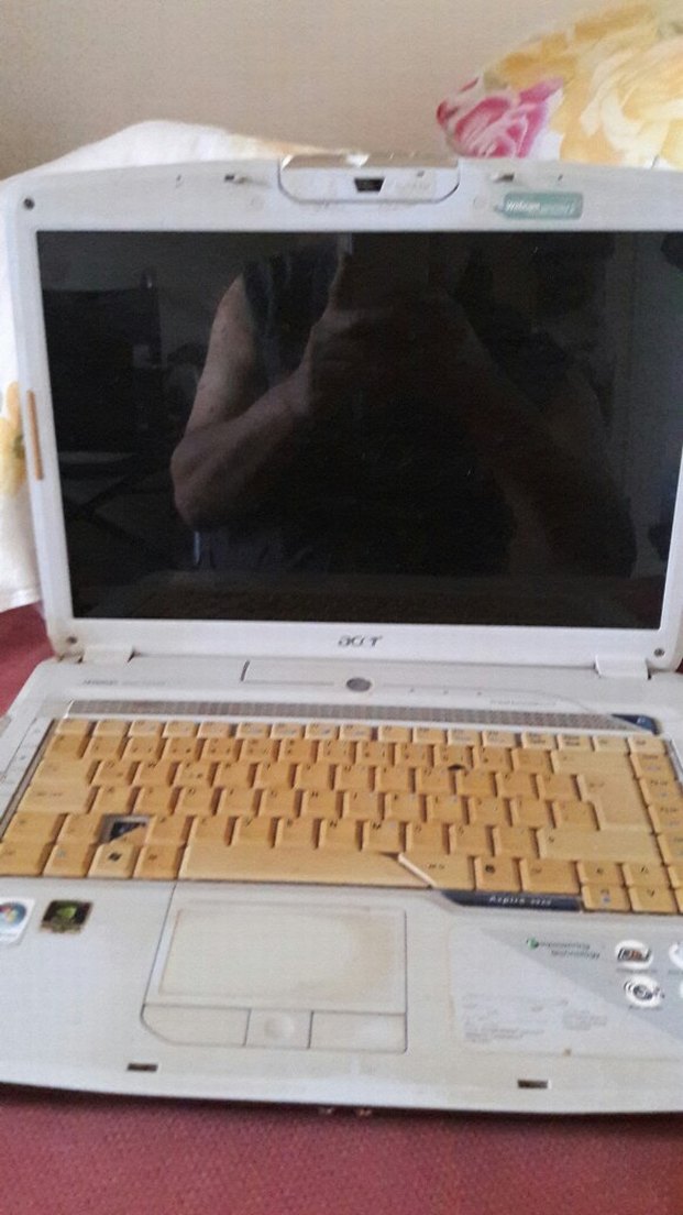 Sarı klavyeye sahip beyaz Acer dizüstü bilgisayar, kullanılmış ve aşınma izleri görülmektedir. Dokunmatik yüzey ve çeşitli etiketler mevcuttur.tuşu yaptırmaya gerek yoktur.uzak klavye iş görur