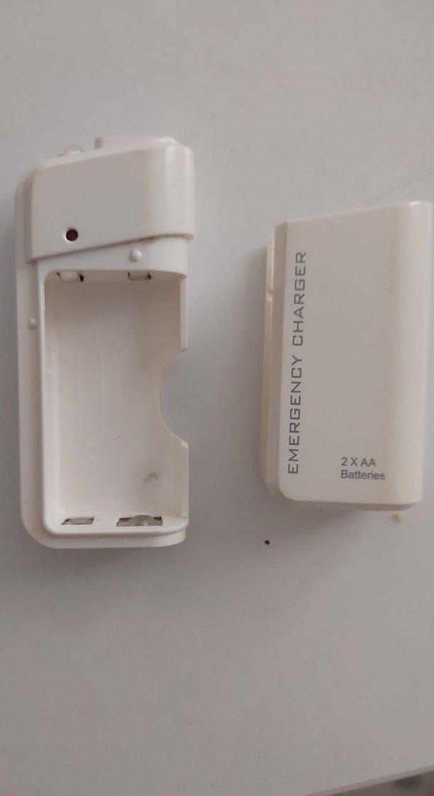 2 adet AA pil ile çalışan beyaz acil telefon şarj cihazı. Kompakt ve taşınabilir tasarım. ⚡