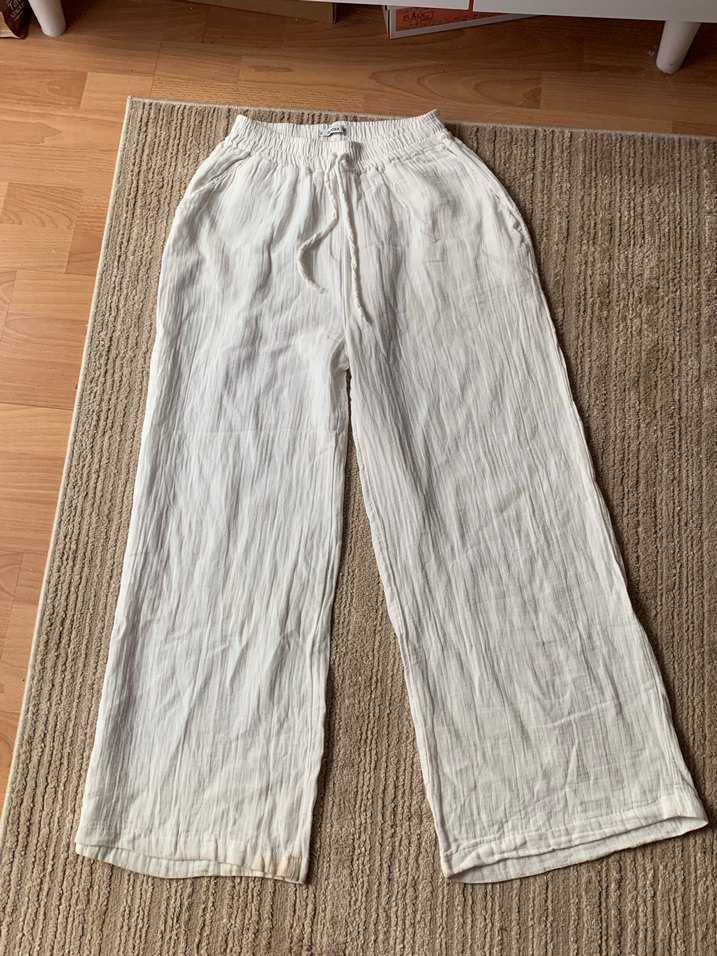 Beyaz keten kumaştan, rahat kesim pantolon