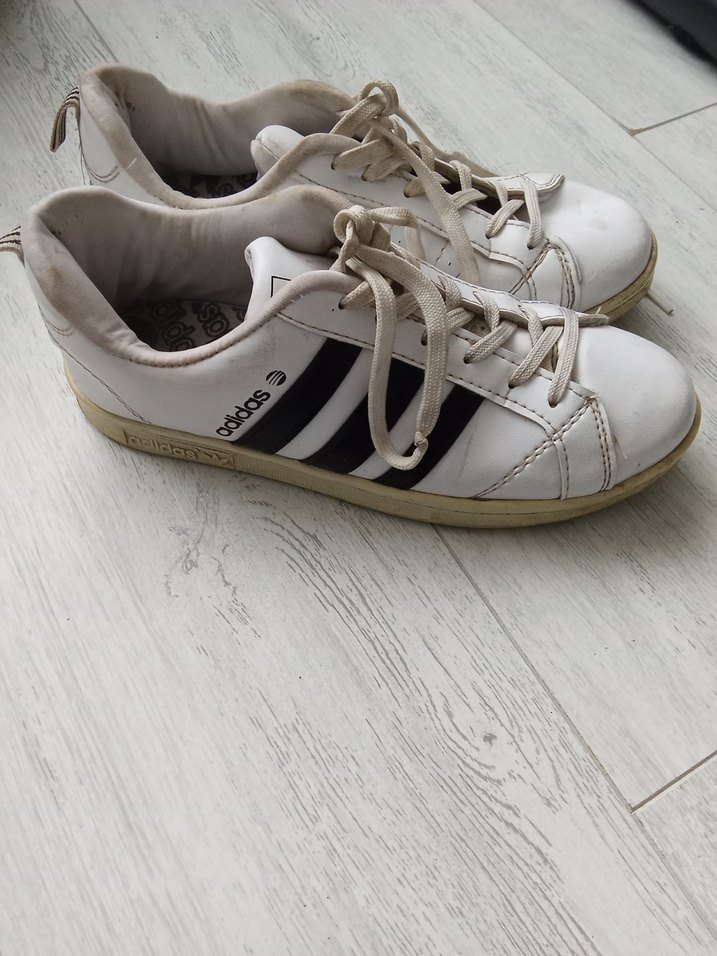Beyaz Adidas kadın spor ayakkabısı, bağcıklı ve kauçuk tabanlıdır. Siyah şeritlerle klasik sokak stili sunar. Günlük kullanıma uygundur.