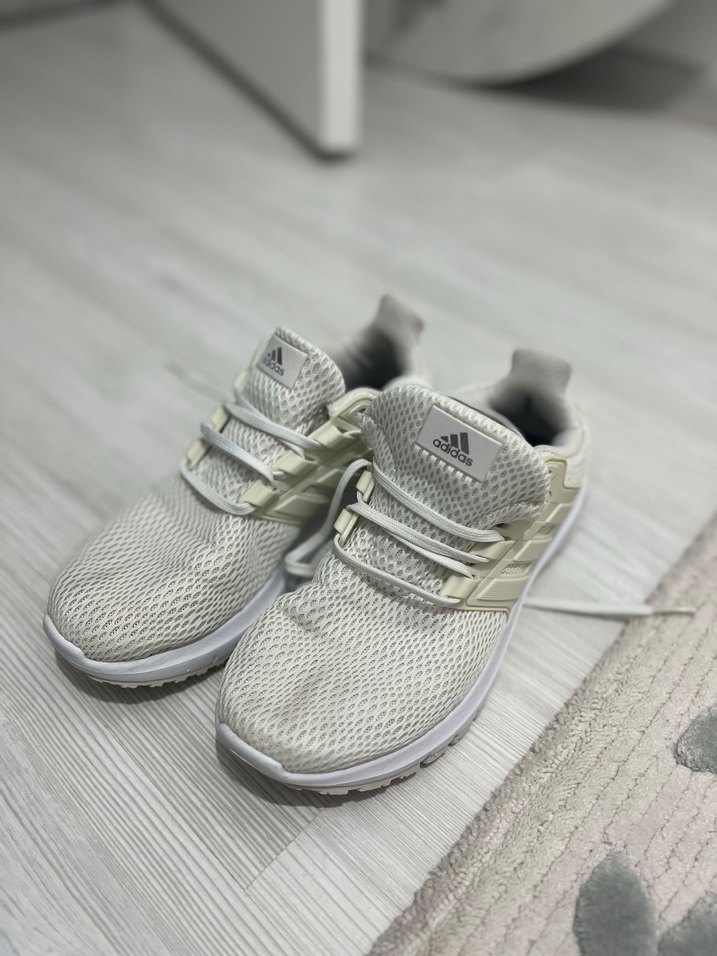 Beyaz Adidas bağcıklı kadın spor ayakkabısı, kauçuk tabanlı, spor ve sokak stiline uygun rahat tasarım. Trendy ve günlük kullanıma uygun.