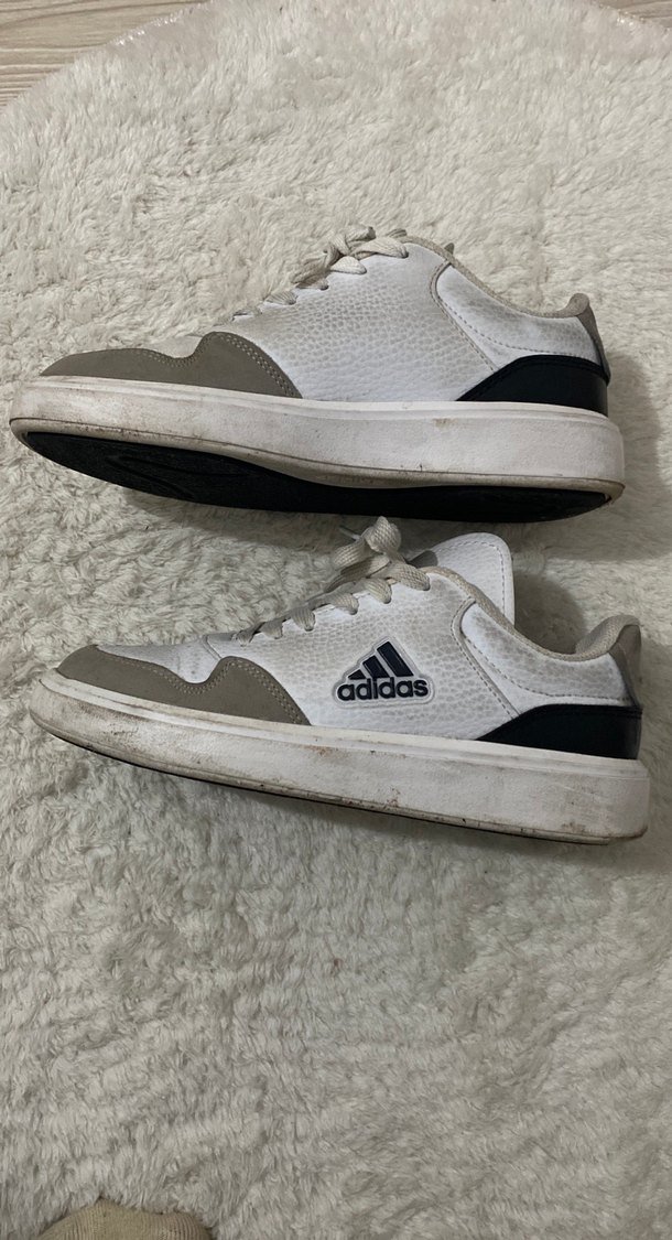 Beyaz Adidas bağcıklı sneakers, lastik taban ve gri-siyah detaylarla spor sokak stili için uygundur.
