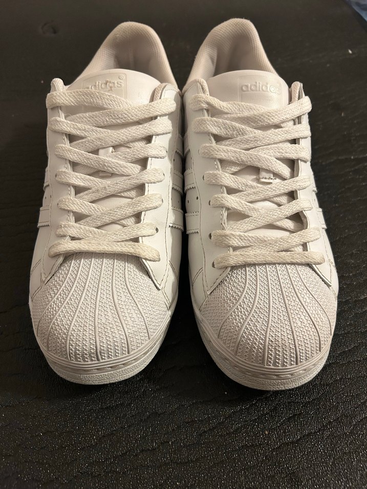 Beyaz Adidas bağcıklı spor ayakkabı, düz kauçuk tabanlı ve dokulu ön yüzeye sahip. Trendy casual ve street wear tarzları için uygun.