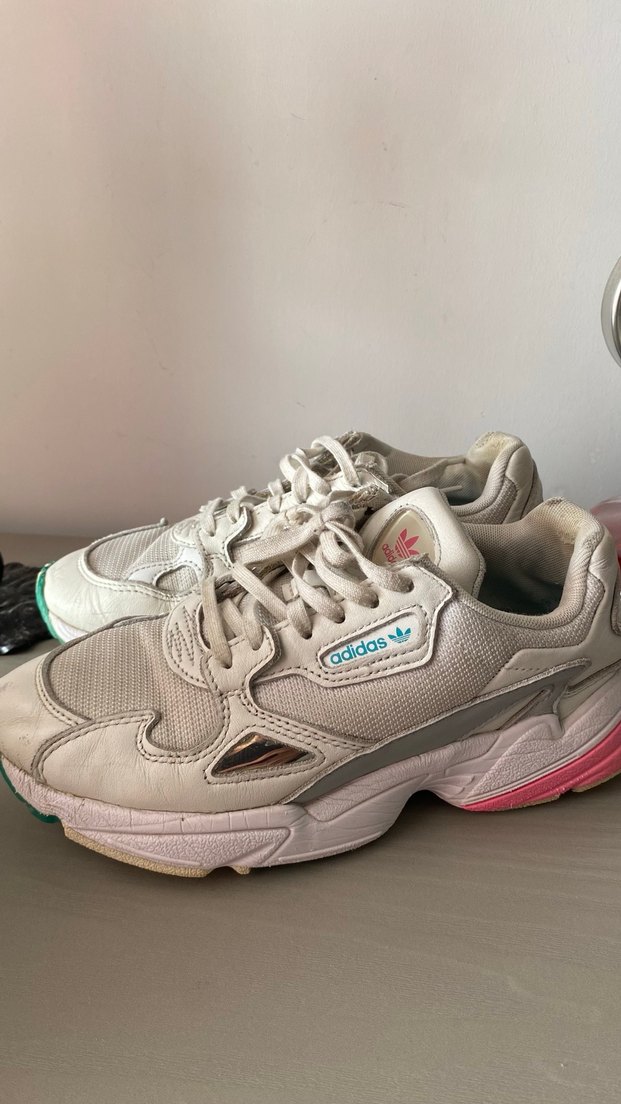 Beyaz Adidas bağcıklı, stiletto topuklu spor ayakkabı, desen içermeyen tasarımı ve kauçuk tabanı ile spor sokak stiline uygun.