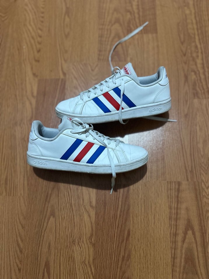Beyaz Adidas spor ayakkabılar, kırmızı ve mavi çizgiler, bağcıklı tasarım ve kauçuk taban içerir. Spor ve günlük sokak stili için uygundur. Orjinal faturası yoktur.İç astarı yoktur görüldüğü gibidir.46 numara